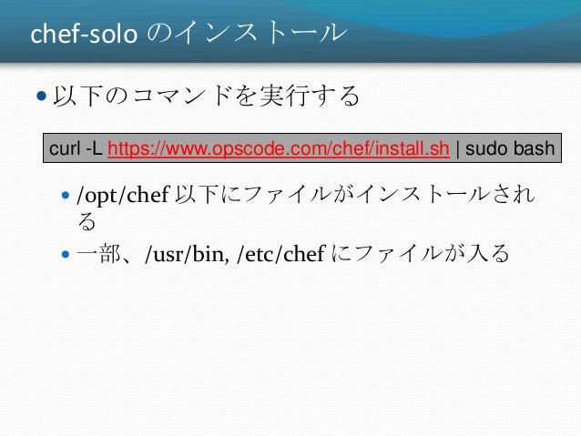 23. 23. chef-solo のインストール  以下のコマンドを実行する  /opt/chef 以下にファイルがインストールされ る  一部、/usr/bin, /etc/chef にファイルが入る curl -L https://www.opscode.com/chef/install.sh | sudo bash