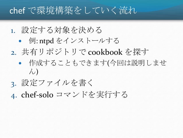 24. 24. chef で環境構築をしていく流れ 1. 設定する対象を決める  例: ntpd をインストールする 2. 共有リポジトリで cookbook を探す  作成することもできます(今回は説明しませ ん) 3. 設定ファイルを書く 4. chef-solo コマンドを実行する