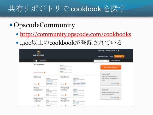 25. 25. 共有リポジトリで cookbook を探す  OpscodeCommunity  http://community.opscode.com/cookbooks  1,100以上のcookbookが登録されている