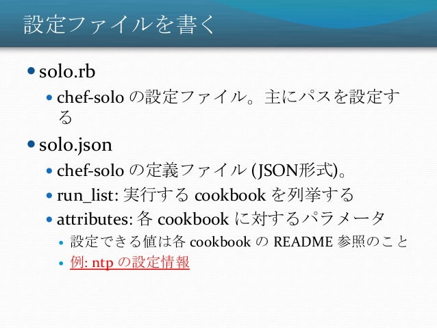 26. 26. 設定ファイルを書く  solo.rb  chef-solo の設定ファイル。主にパスを設定す る  solo.json  chef-solo の定義ファイル (JSON形式)。  run_list: 実行する cookbook を列挙する  attributes: 各 cookbook に対するパラメータ  設定できる値は各 cookbook の README 参照のこと  例: ntp の設定情報