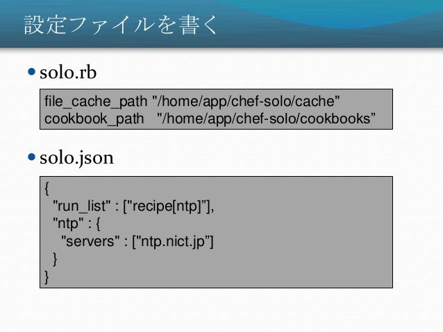 27. 27. 設定ファイルを書く  solo.rb  solo.json file_cache_path "/home/app/chef-solo/cache" cookbook_path "/home/app/chef-solo/cookbooks” { "run_list" : ["recipe[ntp]”], "ntp" : { "servers" : ["ntp.nict.jp”] } }