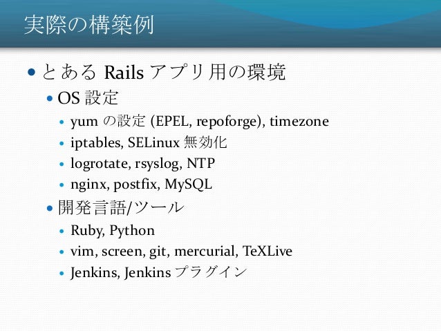 29. 29. 実際の構築例  とある Rails アプリ用の環境  OS 設定  yum の設定 (EPEL, repoforge), timezone  iptables, SELinux 無効化  logrotate, rsyslog, NTP  nginx, postfix, MySQL  開発言語/ツール  Ruby, Python  vim, screen, git, mercurial, TeXLive  Jenkins, Jenkins プラグイン