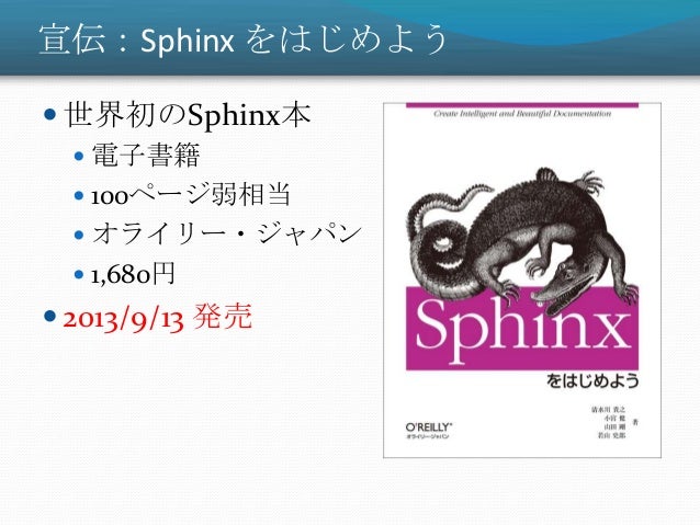3. 3. 宣伝:Sphinx をはじめよう  世界初のSphinx本  電子書籍  100ページ弱相当  オライリー・ジャパン  1,680円  2013/9/13 発売