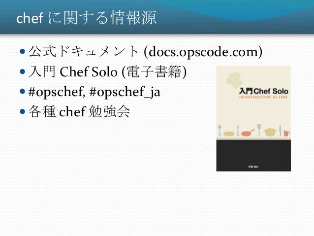 30. 30. chef に関する情報源  公式ドキュメント (docs.opscode.com)  入門 Chef Solo (電子書籍)  #opschef, #opschef_ja  各種 chef 勉強会