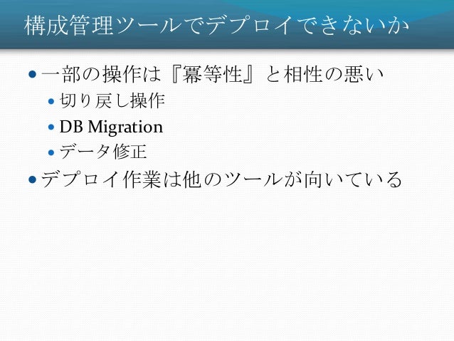 33. 33. 構成管理ツールでデプロイできないか  一部の操作は『冪等性』と相性の悪い  切り戻し操作  DB Migration  データ修正  デプロイ作業は他のツールが向いている