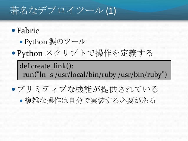 34. 34. 著名なデプロイツール (1)  Fabric  Python 製のツール  Python スクリプトで操作を定義する  プリミティブな機能が提供されている  複雑な操作は自分で実装する必要がある def create_link(): run("ln -s /usr/local/bin/ruby /usr/bin/ruby”)