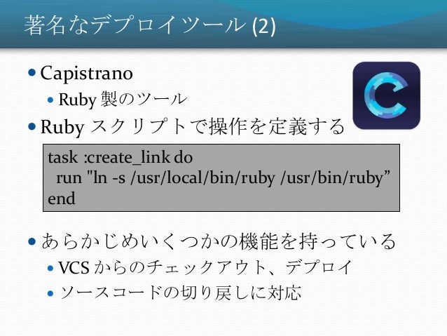 35. 35. 著名なデプロイツール (2)  Capistrano  Ruby 製のツール  Ruby スクリプトで操作を定義する  あらかじめいくつかの機能を持っている  VCS からのチェックアウト、デプロイ  ソースコードの切り戻しに対応 task :create_link do run "ln -s /usr/local/bin/ruby /usr/bin/ruby” end