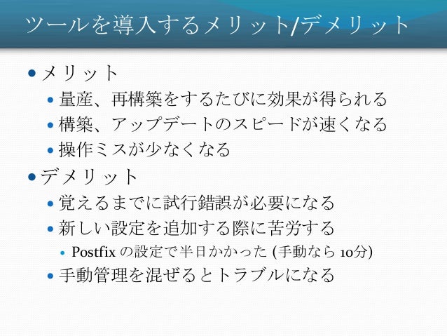 37. 37. ツールを導入するメリット/デメリット  メリット  量産、再構築をするたびに効果が得られる  構築、アップデートのスピードが速くなる  操作ミスが尐なくなる  デメリット  覚えるまでに試行錯誤が必要になる  新しい設定を追加する際に苦労する  Postfix の設定で半日かかった (手動なら 10分)  手動管理を混ぜるとトラブルになる