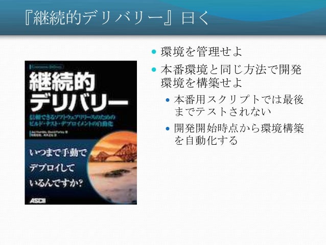 9. 9.  環境を管理せよ  本番環境と同じ方法で開発 環境を構築せよ  本番用スクリプトでは最後 までテストされない  開発開始時点から環境構築 を自動化する 『継続的デリバリー』曰く