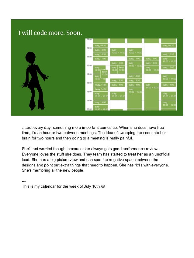 Your job title says "engineer", but you seem to spend most of your time in meetings. You'd like to have time for code, but then who will respond to customers, update the roadmap, talk to the teams whose projects overlap with yours, notice the things that got dropped, onboard the new folks, and ask all of the many questions that need to be asked to make the project successful?
