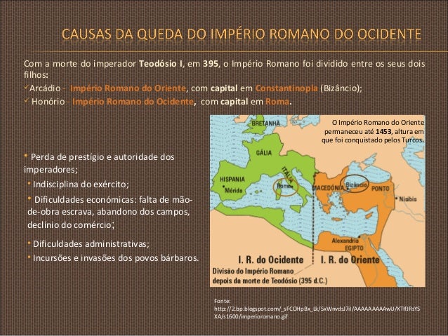 2. 2. Com a morte do imperador Teodósio I, em 395, o Império Romano foi dividido entre os seus dois filhos: Arcádio - Império Romano do Oriente, com capital em Constantinopla (Bizâncio);  Honório - Império Romano do Ocidente, com capital em Roma. O Império Romano do Oriente permaneceu até 1453, altura em que foi conquistado pelos Turcos. • Perda de prestígio e autoridade dos imperadores; • Indisciplina do exército; • Dificuldades económicas: falta de mãode-obra escrava, abandono dos campos, declínio do comércio; • Dificuldades administrativas; • Incursões e invasões dos povos bárbaros. Fonte: http://2.bp.blogspot.com/_sFCOHpBx_Lk/SxWnvdsJ7iI/AAAAAAAAAwU/XTIfJRsYS XA/s1600/imperioromano.gif