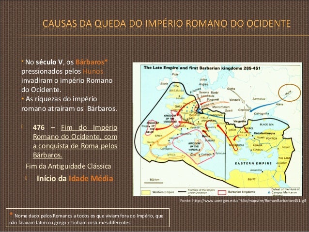 3. 3. • No século V, os Bárbaros* pressionados pelos Hunos invadiram o império Romano do Ocidente. • As riquezas do império romano atraíram os Bárbaros.  476 – Fim do Império Romano do Ocidente, com a conquista de Roma pelos Bárbaros. Fim da Antiguidade Clássica  Início da Idade Média Fonte: http://www.uoregon.edu/~klio/maps/re/RomanBarbarian451.gif * Nome dado pelos Romanos a todos os que viviam fora do Império, que não falavam latim ou grego e tinham costumes diferentes.
