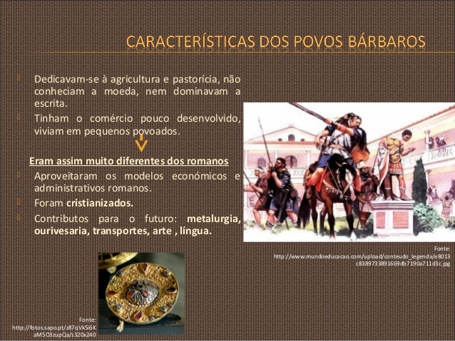 4. 4.      Dedicavam-se à agricultura e pastorícia, não conheciam a moeda, nem dominavam a escrita. Tinham o comércio pouco desenvolvido, viviam em pequenos povoados. Eram assim muito diferentes dos romanos Aproveitaram os modelos económicos e administrativos romanos. Foram cristianizados. Contributos para o futuro: metalurgia, ourivesaria, transportes, arte , língua. Fonte: http://www.mundoeducacao.com/upload/conteudo_legenda/e8013 c8389733891669db7190a711d3c.jpg Fonte: http://fotos.sapo.pt/z87qVk5i6K aM5O3zupQa/s320x240