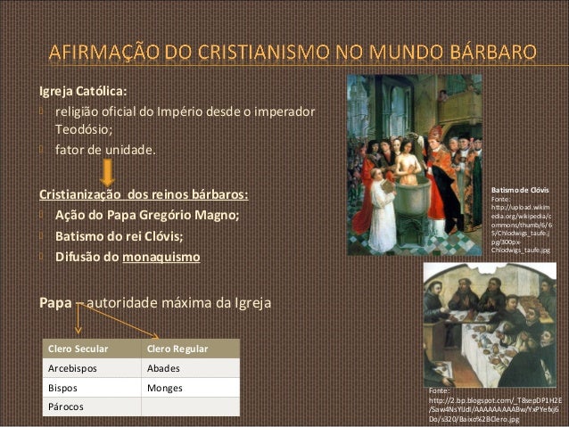 6. 6. Igreja Católica:  religião oficial do Império desde o imperador Teodósio;  fator de unidade. Cristianização dos reinos bárbaros:  Ação do Papa Gregório Magno;  Batismo do rei Clóvis;  Difusão do monaquismo Batismo de Clóvis Fonte: http://upload.wikim edia.org/wikipedia/c ommons/thumb/6/6 5/Chlodwigs_taufe.j pg/300pxChlodwigs_taufe.jpg Papa – autoridade máxima da Igreja Clero Secular Clero Regular Arcebispos Abades Bispos Monges Párocos Fonte: http://2.bp.blogspot.com/_T8sepDP1H2E /Saw4NsYlJdI/AAAAAAAAABw/YxPYefxj6 Do/s320/Baixo%2BClero.jpg
