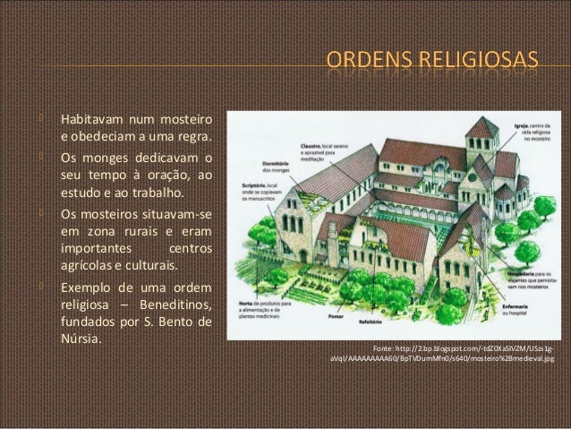 7. 7.  Habitavam num mosteiro e obedeciam a uma regra.  Os monges dedicavam o seu tempo à oração, ao estudo e ao trabalho.  Os mosteiros situavam-se em zona rurais e eram importantes centros agrícolas e culturais.  Exemplo de uma ordem religiosa – Beneditinos, fundados por S. Bento de Núrsia. Fonte: http://2.bp.blogspot.com/-tdZ0XaSIVZM/USzs1gaVqI/AAAAAAAAA60/BpTVDumMfn0/s640/mosteiro%2Bmedieval.jpg