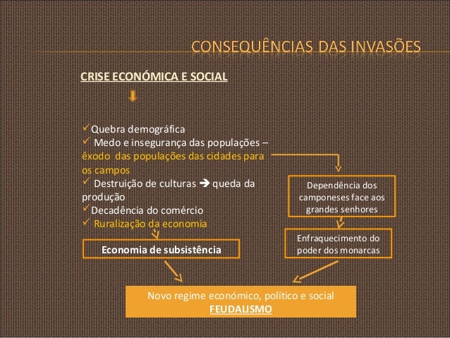 9. 9. CRISE ECONÓMICA E SOCIAL Quebra demográfica  Medo e insegurança das populações – êxodo das populações das cidades para os campos  Destruição de culturas  queda da produção Decadência do comércio  Ruralização da economia Economia de subsistência Dependência dos camponeses face aos grandes senhores Enfraquecimento do poder dos monarcas Novo regime económico, político e social FEUDALISMO
