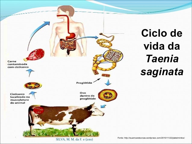 10. 10. Ciclo de vida da Taenia saginata SILVA, M. M. da F. e (2011) Fonte: http://euamoanatureza.wordpress.com/2010/11/22/platelmintos/
