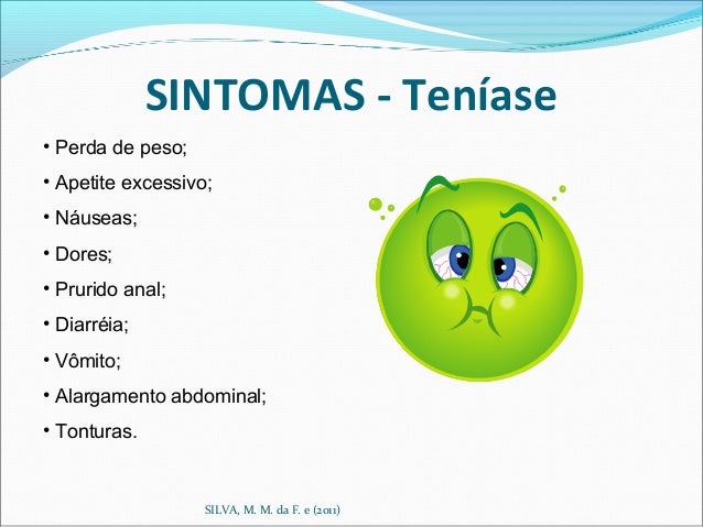 11. 11. SINTOMAS - Teníase • Perda de peso; • Apetite excessivo; • Náuseas; • Dores; • Prurido anal; • Diarréia; • Vômito; • Alargamento abdominal; • Tonturas. SILVA, M. M. da F. e (2011)