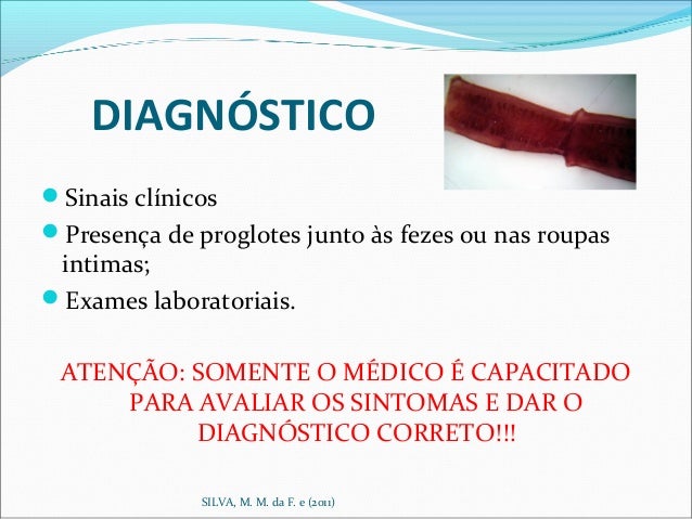 12. 12. DIAGNÓSTICO Sinais clínicos Presença de proglotes junto às fezes ou nas roupas intimas; Exames laboratoriais. ATENÇÃO: SOMENTE O MÉDICO É CAPACITADO PARA AVALIAR OS SINTOMAS E DAR O DIAGNÓSTICO CORRETO!!! SILVA, M. M. da F. e (2011)