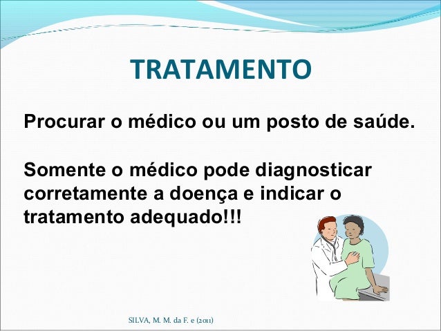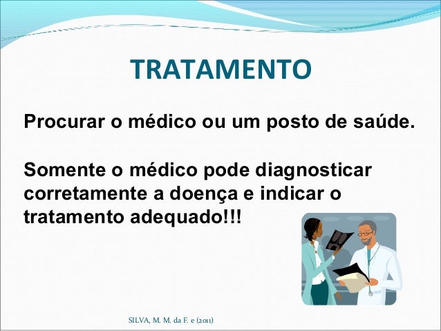 13. 13. TRATAMENTO Procurar o médico ou um posto de saúde. Somente o médico pode diagnosticar corretamente a doença e indicar o tratamento adequado!!! SILVA, M. M. da F. e (2011)