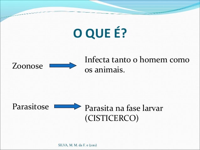 15. 15. O QUE É? SILVA, M. M. da F. e (2011) Zoonose Infecta tanto o homem como os animais. Parasitose Parasita na fase larvar (CISTICERCO)