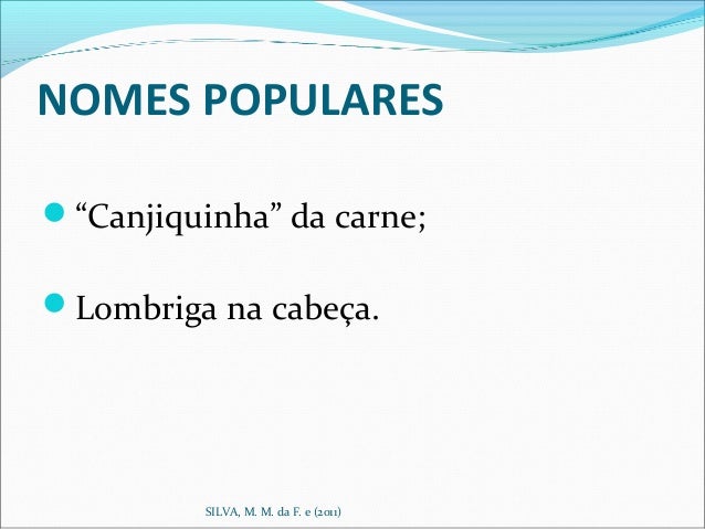 16. 16. NOMES POPULARES “Canjiquinha” da carne; Lombriga na cabeça. SILVA, M. M. da F. e (2011)