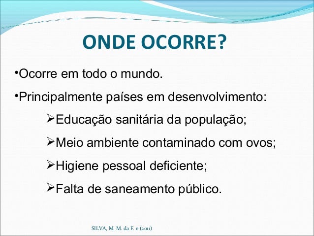 17. 17. ONDE OCORRE? •Ocorre em todo o mundo. •Principalmente países em desenvolvimento: Educação sanitária da população; Meio ambiente contaminado com ovos; Higiene pessoal deficiente; Falta de saneamento público. SILVA, M. M. da F. e (2011)
