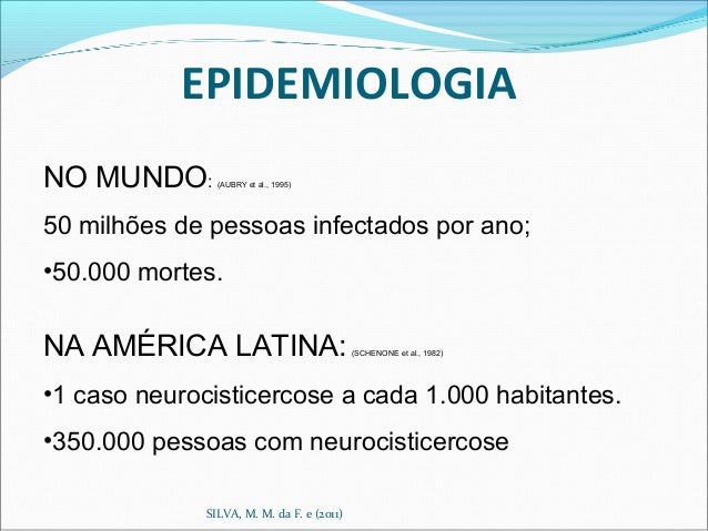 18. 18. EPIDEMIOLOGIA NO MUNDO: (AUBRY et al., 1995) 50 milhões de pessoas infectados por ano; •50.000 mortes. NA AMÉRICA LATINA: (SCHENONE et al., 1982) •1 caso neurocisticercose a cada 1.000 habitantes. •350.000 pessoas com neurocisticercose SILVA, M. M. da F. e (2011)