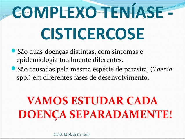 2. 2. COMPLEXO TENÍASE - CISTICERCOSE São duas doenças distintas, com sintomas e epidemiologia totalmente diferentes. São causadas pela mesma espécie de parasita, (Taenia spp.) em diferentes fases de desenvolvimento. VAMOS ESTUDAR CADA DOENÇA SEPARADAMENTE! SILVA, M. M. da F. e (2011)