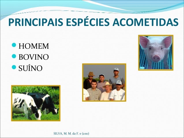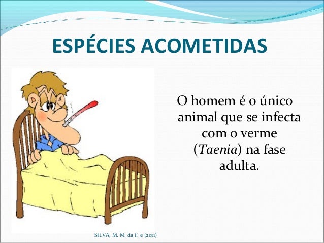 5. 5. ESPÉCIES ACOMETIDAS SILVA, M. M. da F. e (2011) O homem é o único animal que se infecta com o verme (Taenia) na fase adulta.