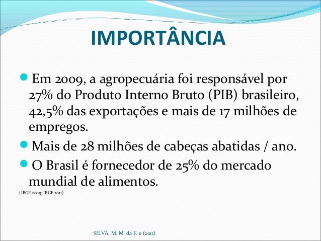 23. 23. IMPORTÂNCIA Em 2009, a agropecuária foi responsável por 27% do Produto Interno Bruto (PIB) brasileiro, 42,5% das exportações e mais de 17 milhões de empregos. Mais de 28 milhões de cabeças abatidas / ano. O Brasil é fornecedor de 25% do mercado mundial de alimentos. (IBGE 2009; IBGE 2011) SILVA, M. M. da F. e (2011)
