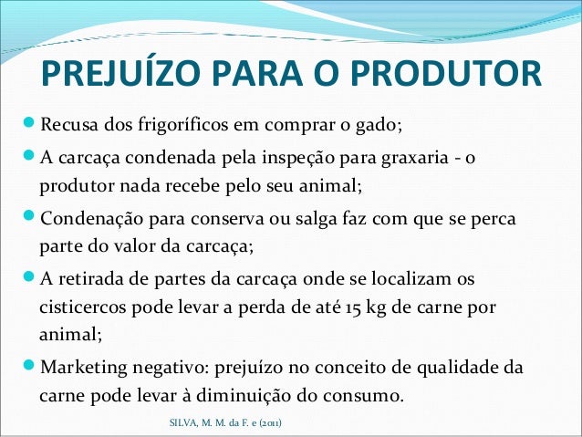 25. 25. PREJUÍZO PARA O PRODUTOR Recusa dos frigoríficos em comprar o gado; A carcaça condenada pela inspeção para graxaria - o produtor nada recebe pelo seu animal; Condenação para conserva ou salga faz com que se perca parte do valor da carcaça; A retirada de partes da carcaça onde se localizam os cisticercos pode levar a perda de até 15 kg de carne por animal; Marketing negativo: prejuízo no conceito de qualidade da carne pode levar à diminuição do consumo. SILVA, M. M. da F. e (2011)