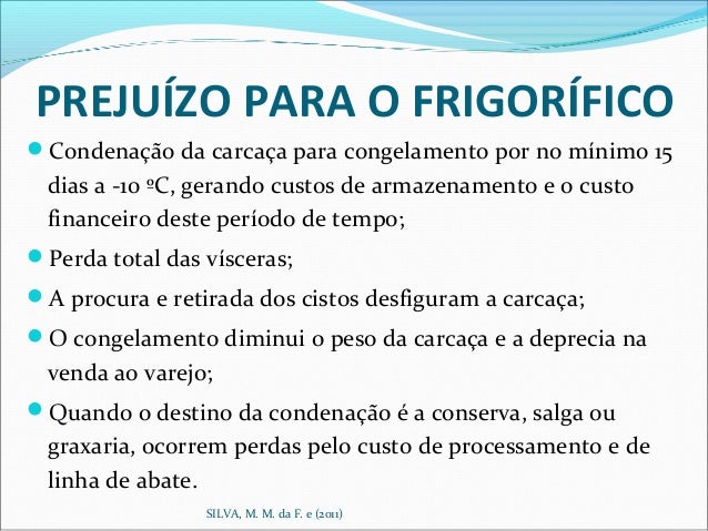 26. 26. PREJUÍZO PARA O FRIGORÍFICO Condenação da carcaça para congelamento por no mínimo 15 dias a -10 ºC, gerando custos de armazenamento e o custo financeiro deste período de tempo; Perda total das vísceras; A procura e retirada dos cistos desfiguram a carcaça; O congelamento diminui o peso da carcaça e a deprecia na venda ao varejo; Quando o destino da condenação é a conserva, salga ou graxaria, ocorrem perdas pelo custo de processamento e de linha de abate. SILVA, M. M. da F. e (2011)