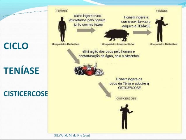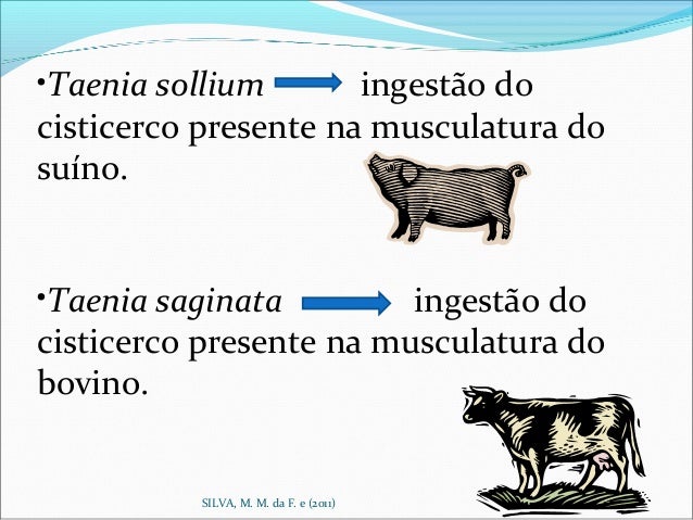 6. 6. •Taenia sollium ingestão do cisticerco presente na musculatura do suíno. •Taenia saginata ingestão do cisticerco presente na musculatura do bovino. SILVA, M. M. da F. e (2011)