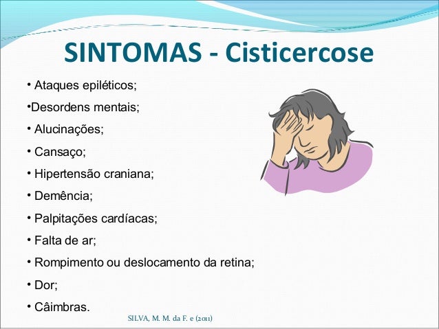 30. 30. SINTOMAS - Cisticercose • Ataques epiléticos; •Desordens mentais; • Alucinações; • Cansaço; • Hipertensão craniana; • Demência; • Palpitações cardíacas; • Falta de ar; • Rompimento ou deslocamento da retina; • Dor; • Câimbras. SILVA, M. M. da F. e (2011)