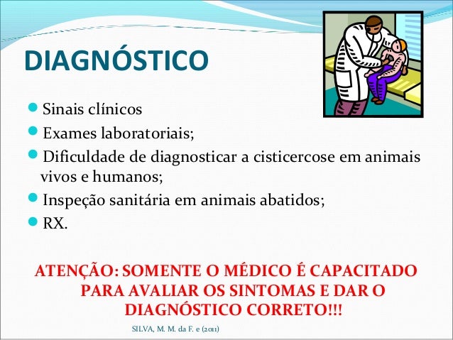 31. 31. DIAGNÓSTICO Sinais clínicos Exames laboratoriais; Dificuldade de diagnosticar a cisticercose em animais vivos e humanos; Inspeção sanitária em animais abatidos; RX. ATENÇÃO: SOMENTE O MÉDICO É CAPACITADO PARA AVALIAR OS SINTOMAS E DAR O DIAGNÓSTICO CORRETO!!! SILVA, M. M. da F. e (2011)