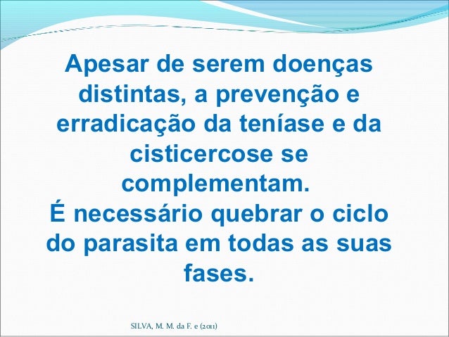 33. 33. Apesar de serem doenças distintas, a prevenção e erradicação da teníase e da cisticercose se complementam. É necessário quebrar o ciclo do parasita em todas as suas fases. SILVA, M. M. da F. e (2011)