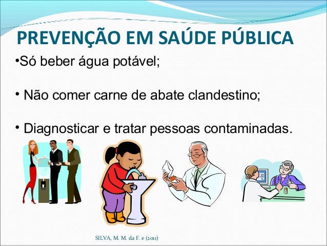 35. 35. PREVENÇÃO EM SAÚDE PÚBLICA •Só beber água potável; • Não comer carne de abate clandestino; • Diagnosticar e tratar pessoas contaminadas. SILVA, M. M. da F. e (2011)