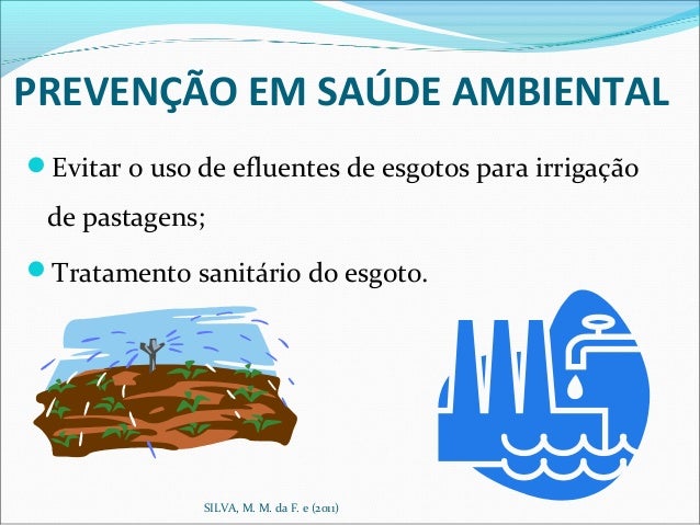 39. 39. PREVENÇÃO EM SAÚDE AMBIENTAL Evitar o uso de efluentes de esgotos para irrigação de pastagens; Tratamento sanitário do esgoto. SILVA, M. M. da F. e (2011)