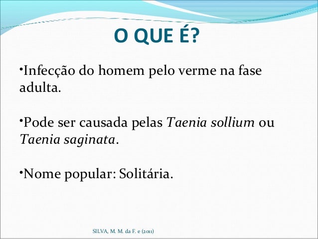 4. 4. O QUE É? •Infecção do homem pelo verme na fase adulta. •Pode ser causada pelas Taenia sollium ou Taenia saginata. •Nome popular: Solitária. SILVA, M. M. da F. e (2011)