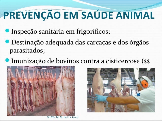 40. 40. PREVENÇÃO EM SAÚDE ANIMAL Inspeção sanitária em frigoríficos; Destinação adequada das carcaças e dos órgãos parasitados; Imunização de bovinos contra a cisticercose ($$ $). SILVA, M. M. da F. e (2011)