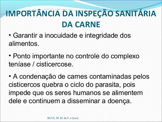 41. 41. IMPORTÂNCIA DA INSPEÇÃO SANITÁRIA DA CARNE • Garantir a inocuidade e integridade dos alimentos. • Ponto importante no controle do complexo teníase / cisticercose. • A condenação de carnes contaminadas pelos cisticercos quebra o ciclo do parasita, pois impede que os seres humanos se alimentem dele e continuem a disseminar a doença. SILVA, M. M. da F. e (2011)