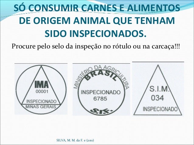 43. 43. SÓ CONSUMIR CARNES E ALIMENTOS DE ORIGEM ANIMAL QUE TENHAM SIDO INSPECIONADOS. Procure pelo selo da inspeção no rótulo ou na carcaça!!! SILVA, M. M. da F. e (2011)