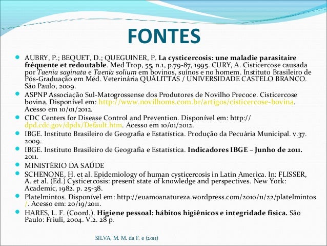 45. 45. FONTES  AUBRY, P.; BEQUET, D.; QUEGUINER, P. La cysticercosis: une maladie parasitaire fréquente et redoutable. Med Trop, 55, n.1, p.79-87, 1995. CURY, A. Cisticercose causada por Taenia saginata e Taenia solium em bovinos, suínos e no homem. Instituto Brasileiro de Pós-Graduação em Méd. Veterinária QUÁLITTAS / UNIVERSIDADE CASTELO BRANCO. São Paulo, 2009.  ASPNP Associação Sul-Matogrossense dos Produtores de Novilho Precoce. Cisticercose bovina. Disponível em: http://www.novilhoms.com.br/artigos/cisticercose-bovina. Acesso em 10/01/2012.  CDC Centers for Disease Control and Prevention. Disponível em: http:// dpd.cdc.gov/dpdx/Default.htm. Acesso em 10/01/2012.  IBGE. Instituto Brasileiro de Geografia e Estatística. Produção da Pecuária Municipal. v.37. SILVA, M. M. da F. e (2011) 2009.  IBGE. Instituto Brasileiro de Geografia e Estatística. Indicadores IBGE – Junho de 2011. 2011.  MINISTÉRIO DA SAÚDE  SCHENONE, H. et al. Epidemiology of human cysticercosis in Latin America. In: FLISSER, A. et al. (Ed.) Cysticercosis: present state of knowledge and perspectives. New York: Academic, 1982. p. 25-38.  Platelmintos. Disponível em: http://euamoanatureza.wordpress.com/2010/11/22/platelmintos /. Acesso em: 20/19/2011.  HARES, L. F. (Coord.). Higiene pessoal: hábitos higiênicos e integridade física. São Paulo: Friuli, 2004. V.2. 28 p.