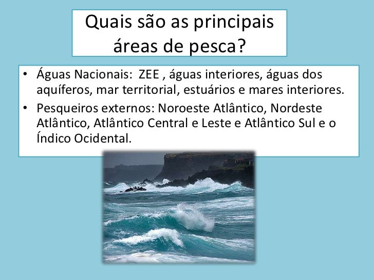 4. 4. Quais são as principais áreas de pesca?<br />Águas Nacionais: ZEE , águas interiores, águas dos aquíferos, mar territorial, estuários e mares interiores.<br />Pesqueiros externos: Noroeste Atlântico, Nordeste Atlântico, AtlânticoCentral e Leste e Atlântico Sul e o Índico Ocidental.<br />