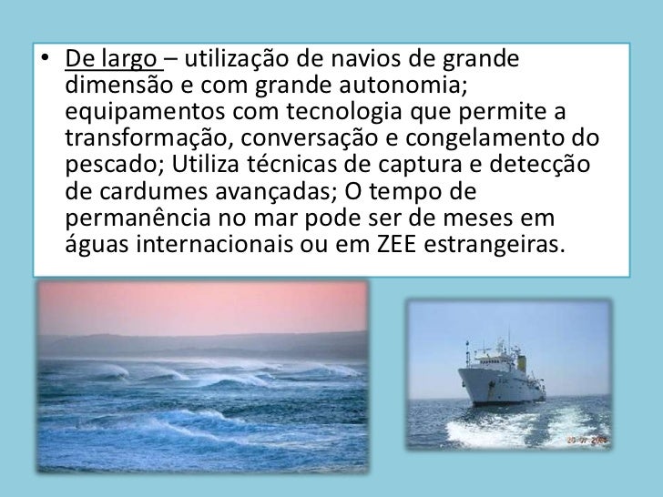 9. 9. De largo – utilização de navios de grande dimensão e com grande autonomia; equipamentos com tecnologia que permite a transformação, conversação e congelamento do pescado; Utiliza técnicas de captura e detecção de cardumes avançadas; O tempo de permanência no mar pode ser de meses em águas internacionais ou em ZEE estrangeiras. <br />