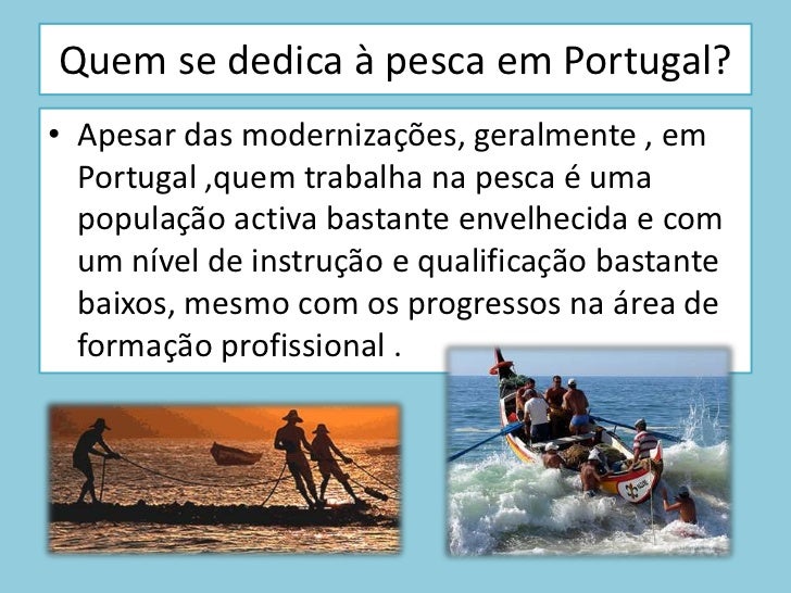 10. 10. Quem se dedica à pesca em Portugal?<br />Apesar das modernizações, geralmente , em Portugal ,quem trabalha na pesca é uma população activa bastante envelhecida e com um nível de instrução e qualificação bastante baixos, mesmo com os progressos na área de formação profissional .<br />
