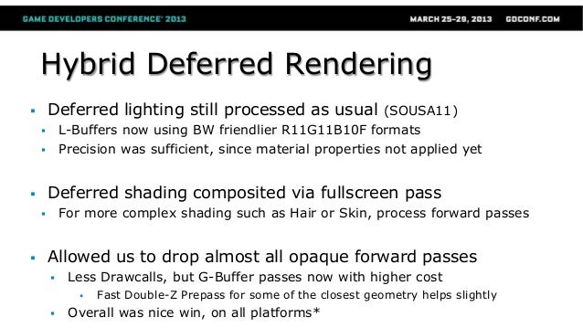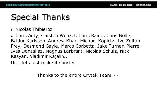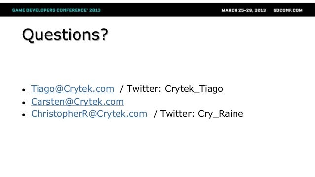 This talk covers changes in CryENGINE 3 technology during 2012, with DX11 related topics such as moving to deferred rendering while maintaining backward compatibility on a multiplatform engine, massive vegetation rendering, MSAA support and how to deal with its common visual artifacts, among other topics.