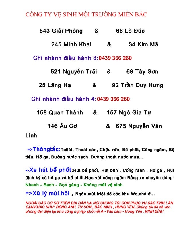 3. 3. CÔNG TY VỆ SINH MÔI TRƯỜNG MIỀN BẮC 543 Giải Phóng & 66 Lò Đúc 245 Minh Khai & 34 Kim Mã Chi nhánh điều hành 3:0439 366 260 521 Nguyễn Trãi & 68 Tây Sơn 25 Lãng Hạ & 92 Trần Duy Hưng Chi nhánh điều hành 4:0439 366 260 158 Quan Thánh & 157 Ngô Gia Tự 146 Âu Cơ & 675 Nguyễn Văn Linh =>Thôngtắc:Toilét, Thoát sàn, Chậu rửa, Bể phốt, Cống ngầm, Bệ tiểu, Hố ga, Đường nước sạch, Đường thoát nước mưa... =>Xe hút bể phốt:Hút bể phốt, Hút bùn , Cống rãnh , Hố ga , Hút định kỳ cá hố ga và bể phốt.Nạo vét cống ngầm Bằng xe chuyên dùng : Nhanh - Sạch - Gọn gàng - Không mất vệ sinh. =>Xử lý mùi hôi , Ngăn mùi triệt để các khu Wc,nhà ở... NGOÀI CÁC CƠ SỞ TRÊN ĐỊA BÀN HÀ NỘI CHÚNG TÔI CÒN PHỤC VỤ CÁC TỈNH LÂN CẬN KHÁC NHƯ: ĐÔNG ANH, TƯ SƠN , BẮC NINH , HƯNG YÊN .Chúng tôi đã có văn phòng đại diện tại khu công nghiệp phố nối A - Văn Lâm - Hưng Yên . NINH BÍNH