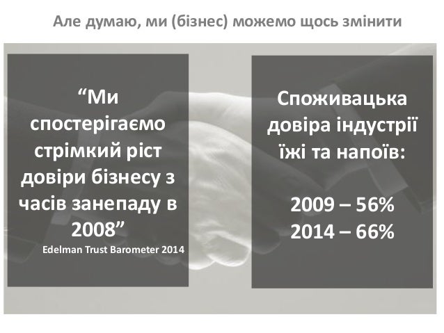 4. 4. Але думаю, ми (бізнес) можемо щось змінити “Ми спостерігаємо стрімкий ріст довіри бізнесу з часів занепаду в 2008” Edelman Trust Barometer 2014 Споживацька довіра індустрії їжі та напоїв: 2009 – 56% 2014 – 66%